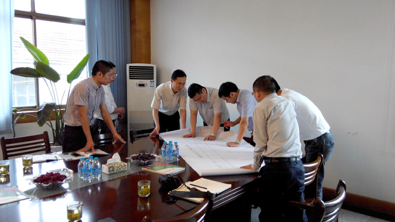 劉區(qū)長(左三)一行在察看行政區(qū)劃圖。